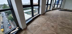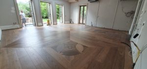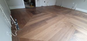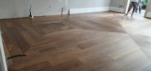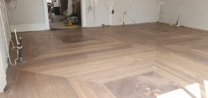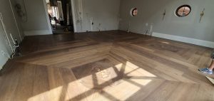 Chevron: Characterized by its ‘V’ shape, chevron floors bring a modern and dynamic feel to spaces. The planks are cut at an angle and fitted together to point in a straight line, creating a seamless zigzag pattern.